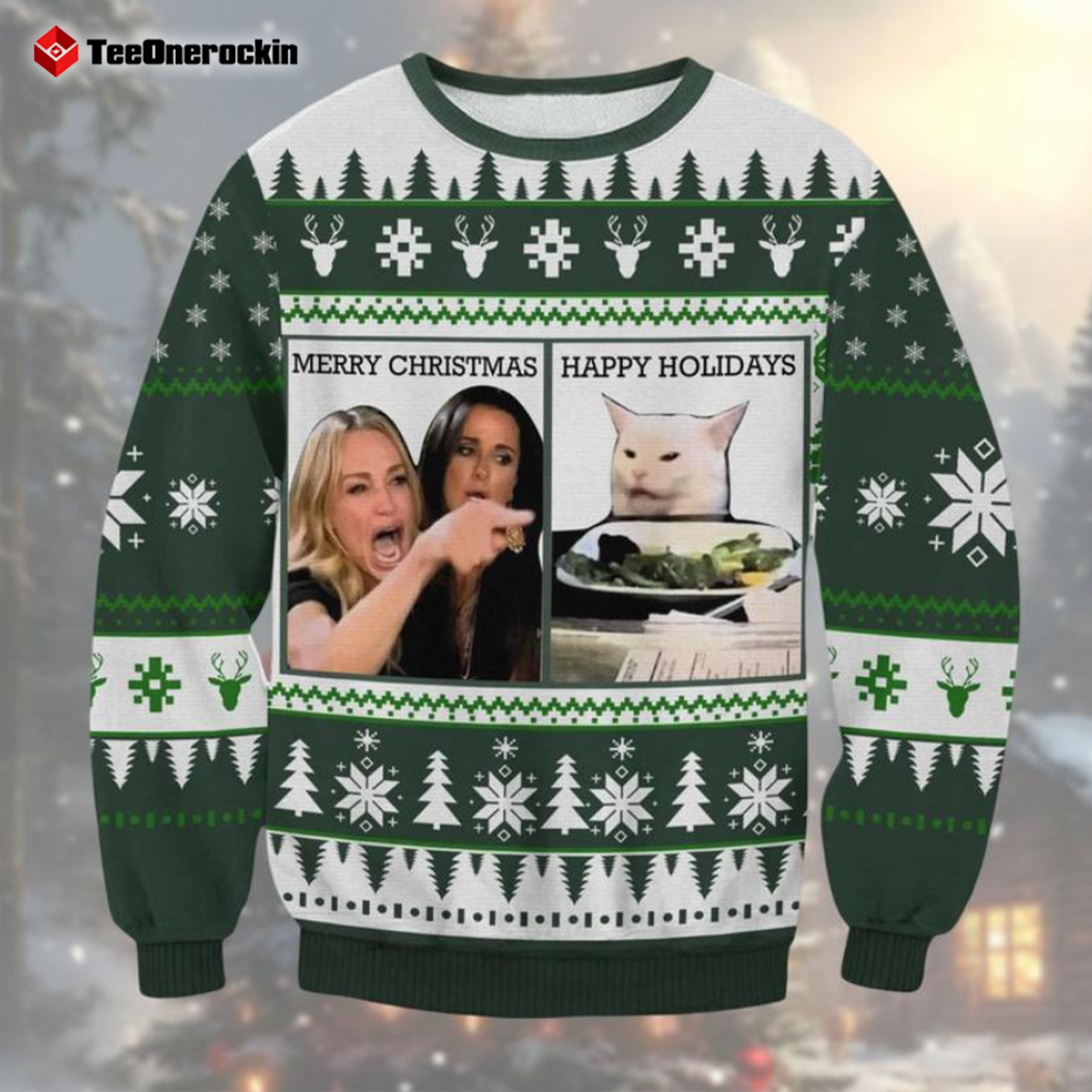 Design: The design is a playful mashup of one of the most popular internet memes and all the festive cheer you’d expect from an ugly Christmas sweater. On the front, you’ll see the familiar image of the woman yelling, paired with the unimpressed, side-eyed cat sitting at the dinner table. The twist? The words “Merry Christmas!” are boldly printed across the graphic, adding a hilarious holiday spin to the famous meme. It’s as if the woman is yelling, “Merry Christmas!”, while the cat responds with a perfect expression of indifference—because, honestly, who hasn’t felt that way at least once during the holidays?